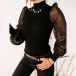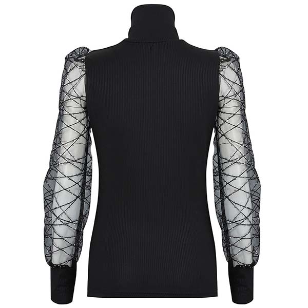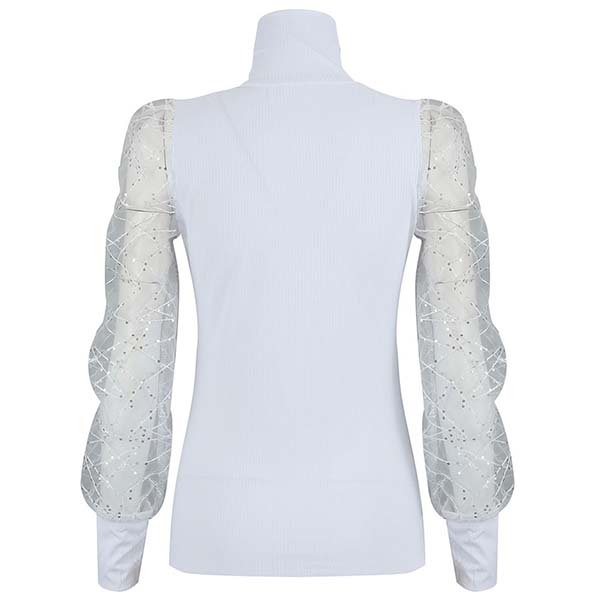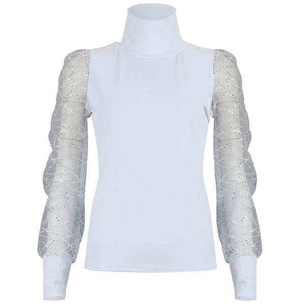Sexy Sequin Gauze Spliced Long Sleeve Mock Neck Slim Fit Top