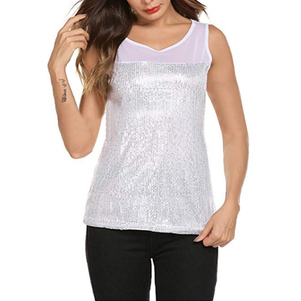 When the days get hot,this sleeveless top can easily arouse your attention. The gauze and sequin spliced details make this piece look so sexy and shinning. No matter matching with your shorts,skirts or jeans,you can have a fashionable look.