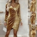Festklänning paljettprydd – sexig figurnära bodycon med V-ringning, rynkad design och asymmetrisk slits