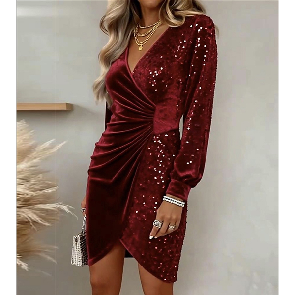 Denna bling-bling-klänning har bländande paljettdetaljer, en smickrande V-ringning och rynkad, asymmetrisk fåll för modern festsofistikering. Perfekt för festliga tillfällen, firanden eller glamourösa, moderiktiga outfits. Finns i flera färger.