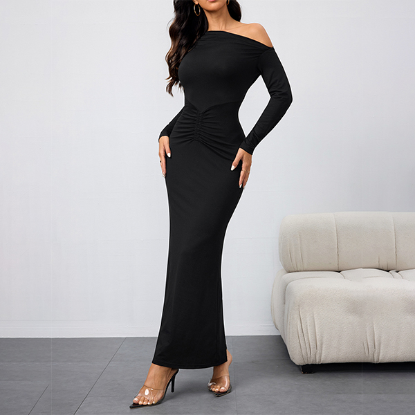 Sexig Snedaxel Långärmad Draperad Bodycon Maxiklänning