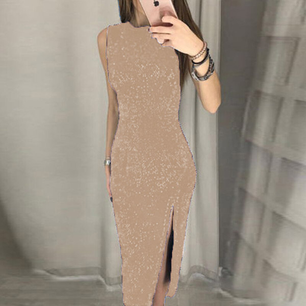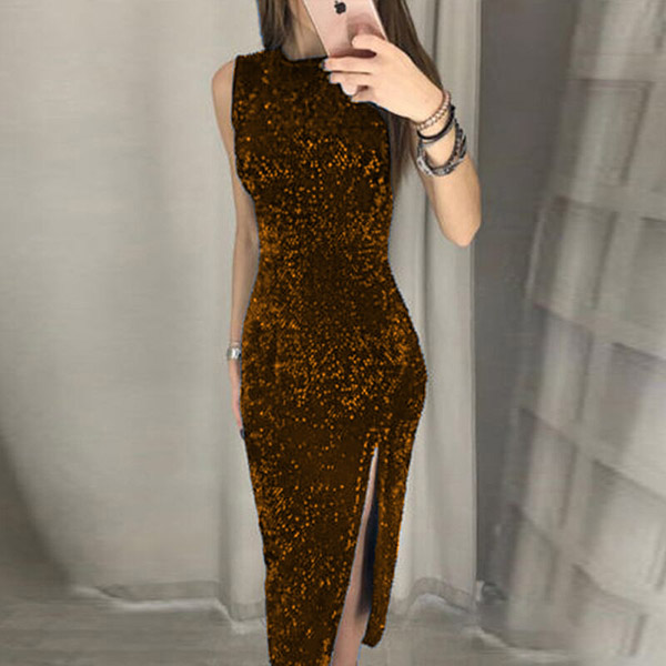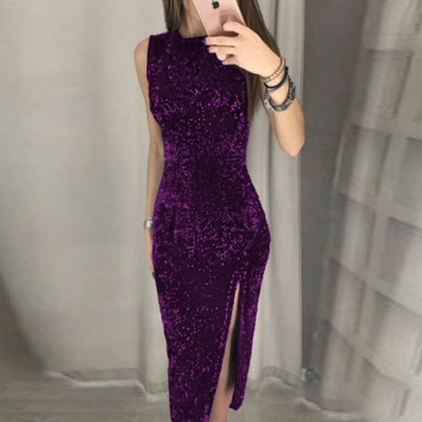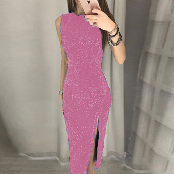 Like the saying goes, if you have it why not flaunt it? Seductive appeal comes easy once you slip into this breathtaking dress. This shinning dress is designed with sleeveless,round neck,slit hem and a fit silhouette,sexy yet sultry. Perfect fit for the parties and gatherings.
