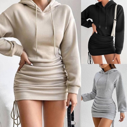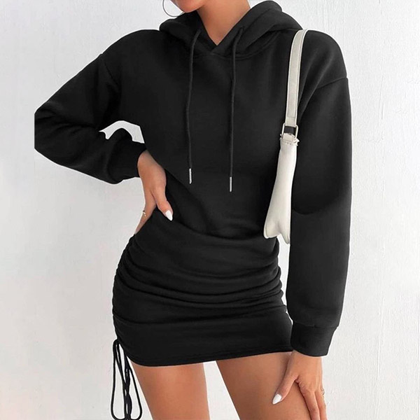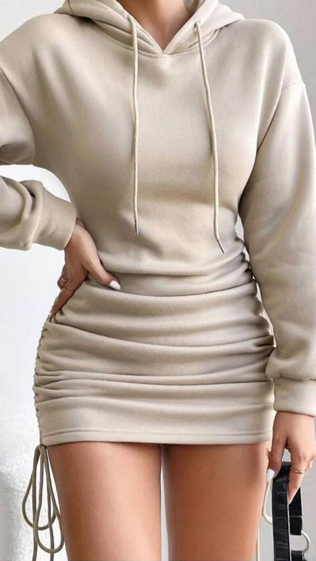 Den här klänningen är tillverkad av högkvalitativt sweatshirttyg och erbjuder både komfort och hållbarhet. Huvan med dragsko ger en sportig och avslappnad atmosfär till klänningen, medan detaljen med dragsko på sidan skapar en rynkig effekt som lägger till visuellt intresse och låter dig anpassa passformen och stilen efter dina önskemål. Denna sweatshirtklänning är designad för att vara både mysig och sexig.