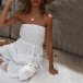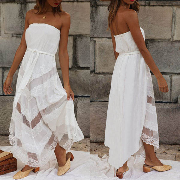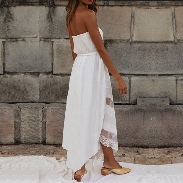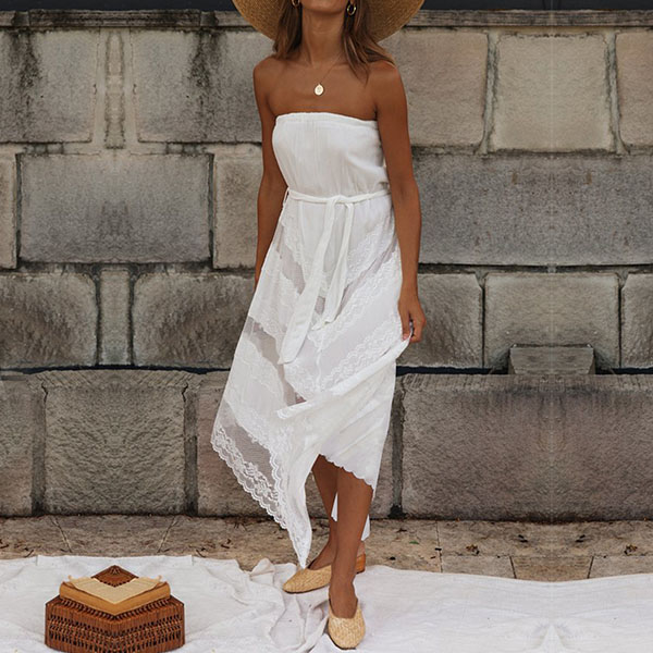 As for a sexy and charming beach look,you can just throw yourself into this dress. Strapless style,designed with an irregular hem and lace spliced details,this dress knows how to express your beauty and charm. On these sunny days,adding a sweet straw hat and sparkle necklace would make you look more beautiful.