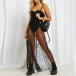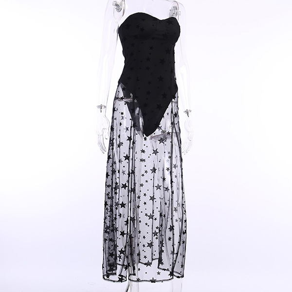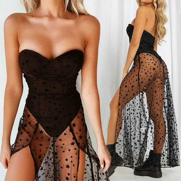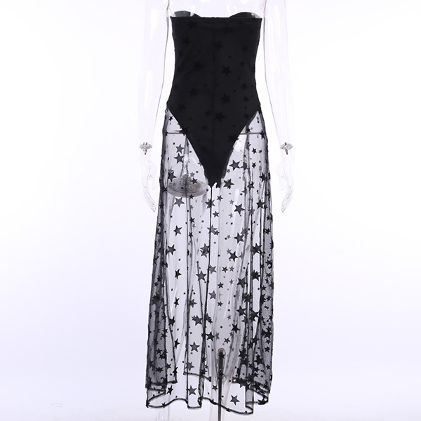 Sexy Strapless See-through Gauze Spliced Slit Hem Bodysuit