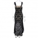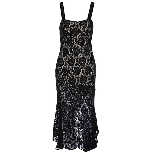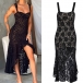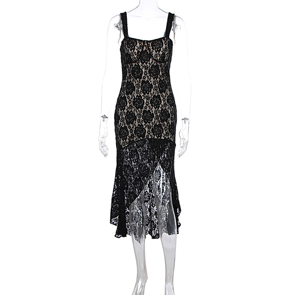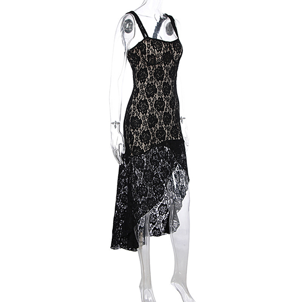 Midi-klänning i spets med sexig hjärtformad urringning och volang, asymmetrisk fåll