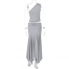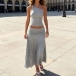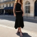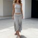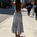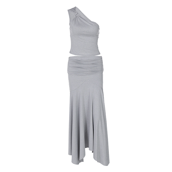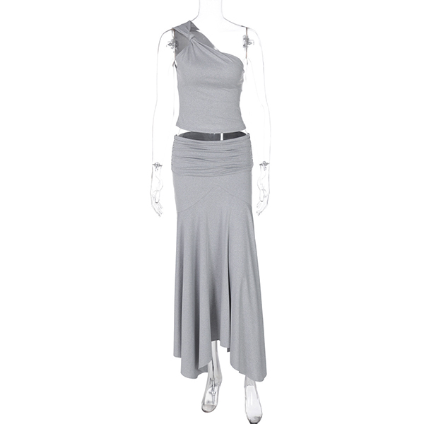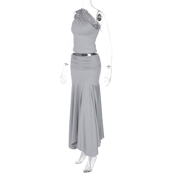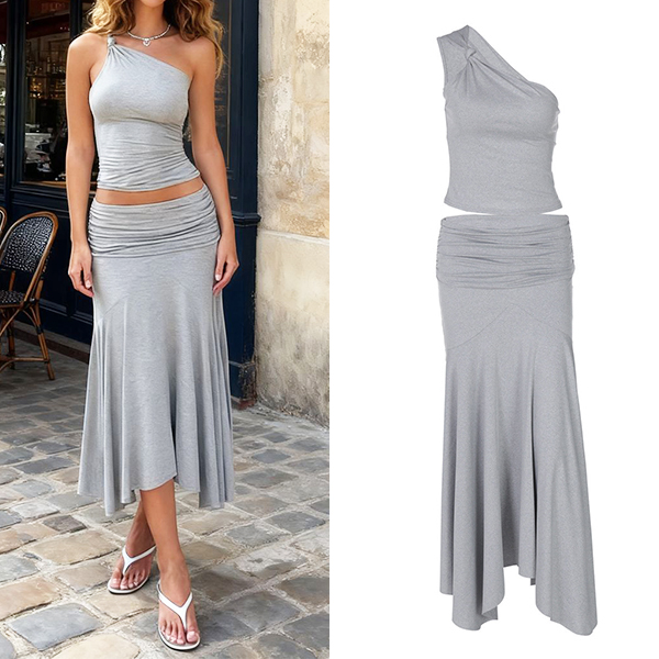 Sexigt tvådelat set med snedskuren topp och låg plisserad kjol