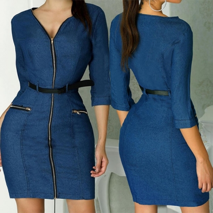 Sexy V-neck 3/4 Sleeve Front-zipper Slim Fit Denim Dress