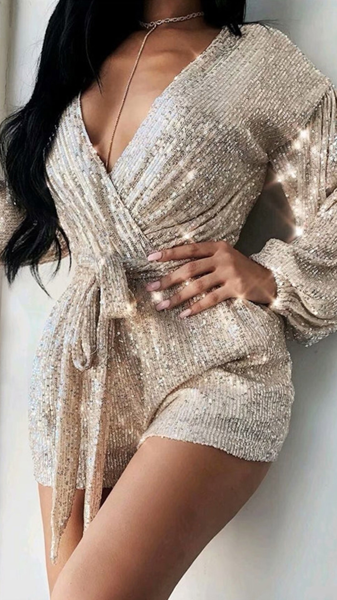 You have no need to worry about what to wear for tonight's cocktail party if you have this dress in your team. The sequin details make this piece look so shinning,while the v-neck,lantern sleeve and irregular hem design will make this piece look sexy and flirty. Just slip into this little stunner to be the most stunning party girl!