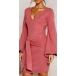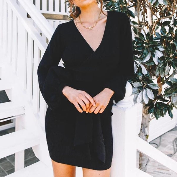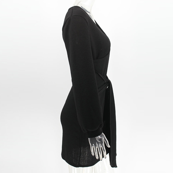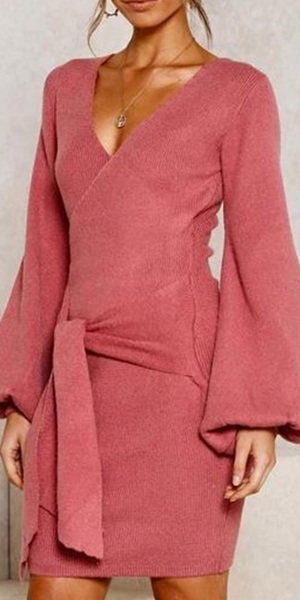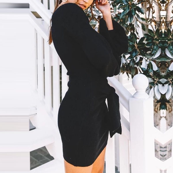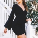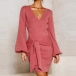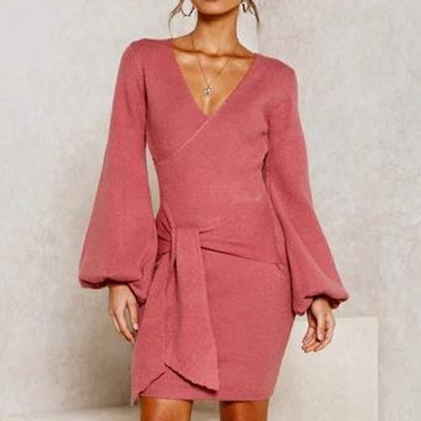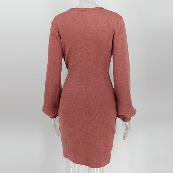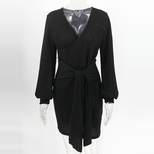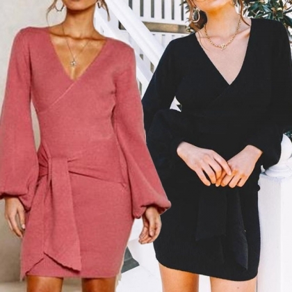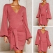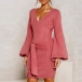 Sexy V-neck Lantern Sleeve Solid Color Lace-up Dress