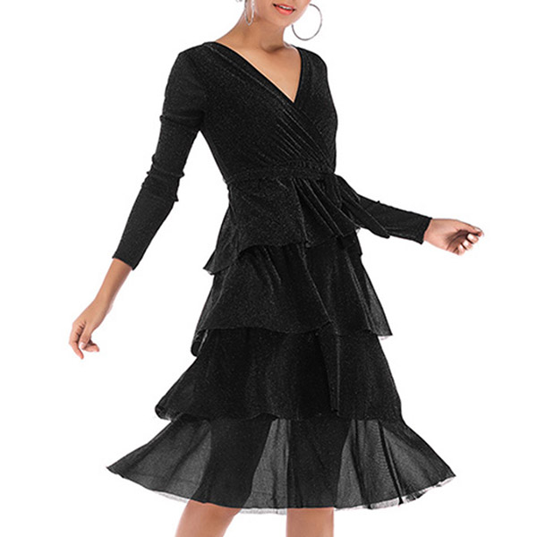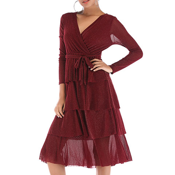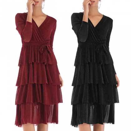 Sexy V-neck Long Sleeve Cake Hem Solid Color Dress