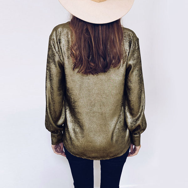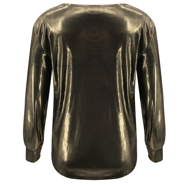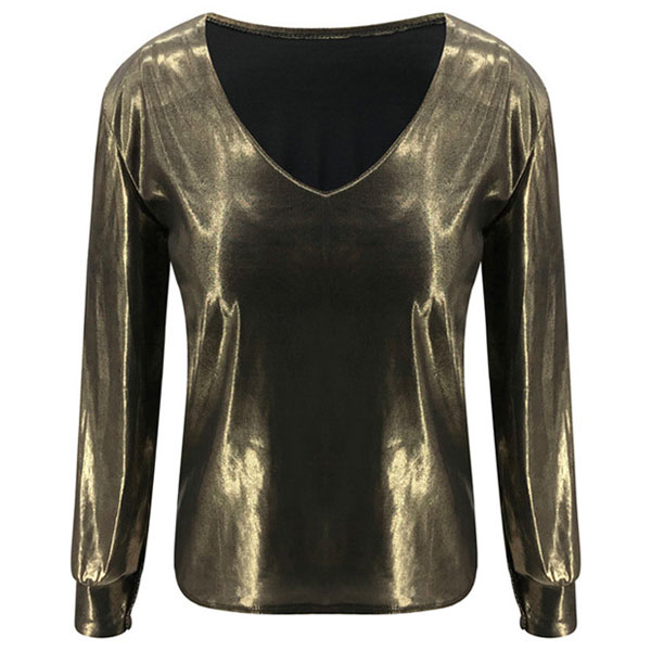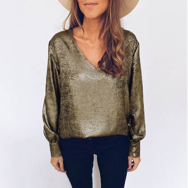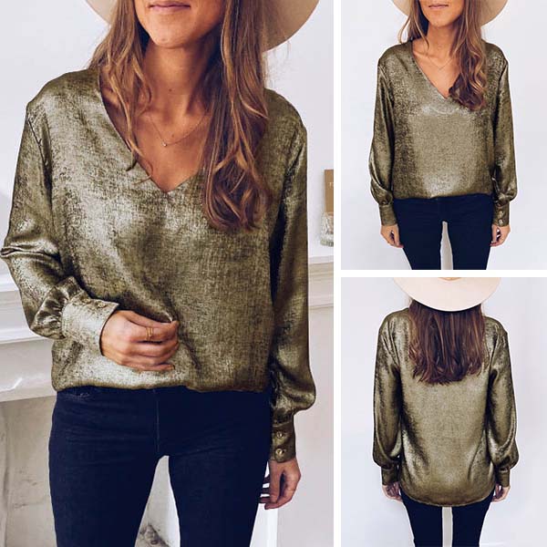 This top comes with a stylish gold tone,finished with long sleeve and v-neck design,which can maintain your style while it keeps you comfy. We suggest you matching with a high waist tight pants to finish a laid-back and stylish daily look.