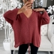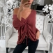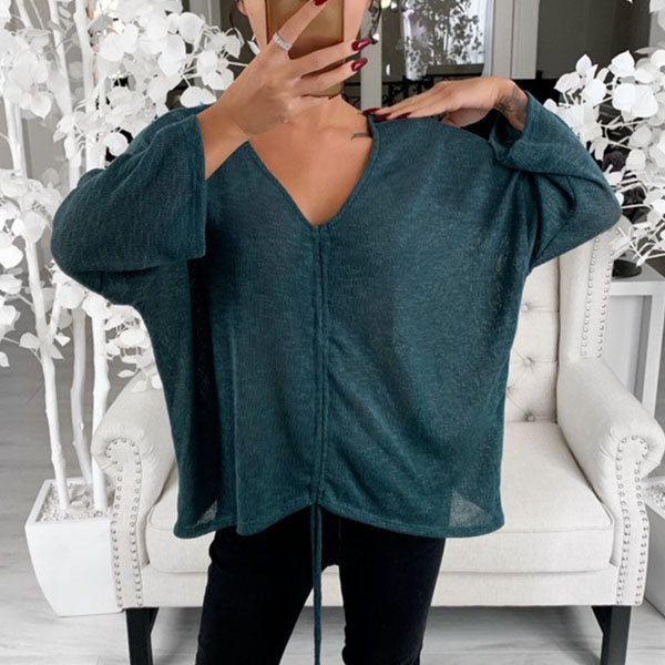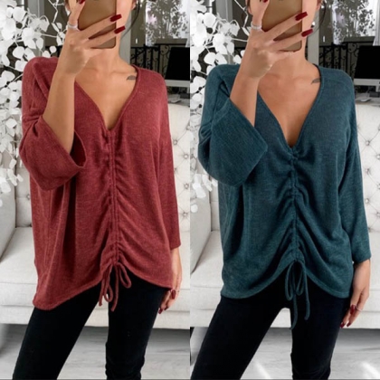 Sexy V-neck Long Sleeve Solid Color Drawstring T-shirt