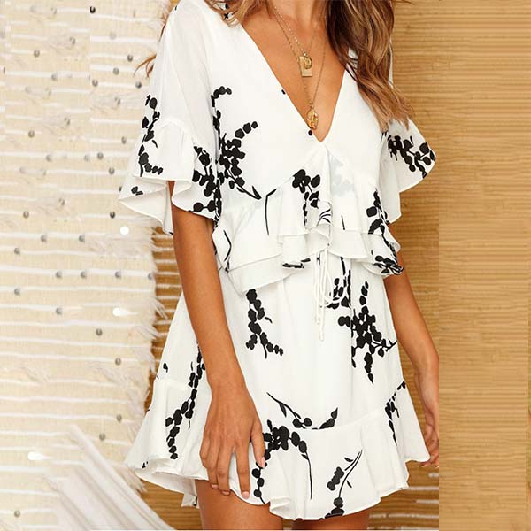If you wanna a dreamy and beautiful beach look,then we suggest you slipping into this dress. Features chic and eye-catching printed details,the v-neck and ruffle design will enhance your femininity. Cozy yet charming,this dress is your summer essential.