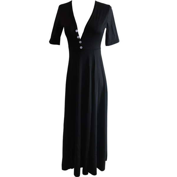 Den här klänningen, med sin klassiska och smickrande svarta färg och slitsfåll, kommer att visa upp din sexiga och generösa sida. Låter det lockande? Köp din egen nu!