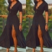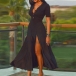 Sexig kortärmad V-ringad klänning med hög midja och slitsfåll