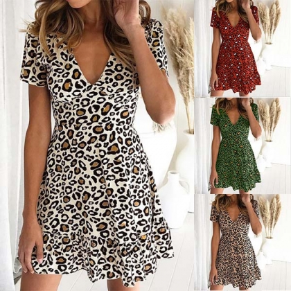 Som vi alla vet kan leopardelementet bättre framhäva din charmiga feminina dragningskraft. Så varför inte ta en titt på denna leopardklänning? Den är designad med kortärmad, v-ringad och hög midja. Den här klänningen kan få dig att se enkelt charmig och vacker ut.