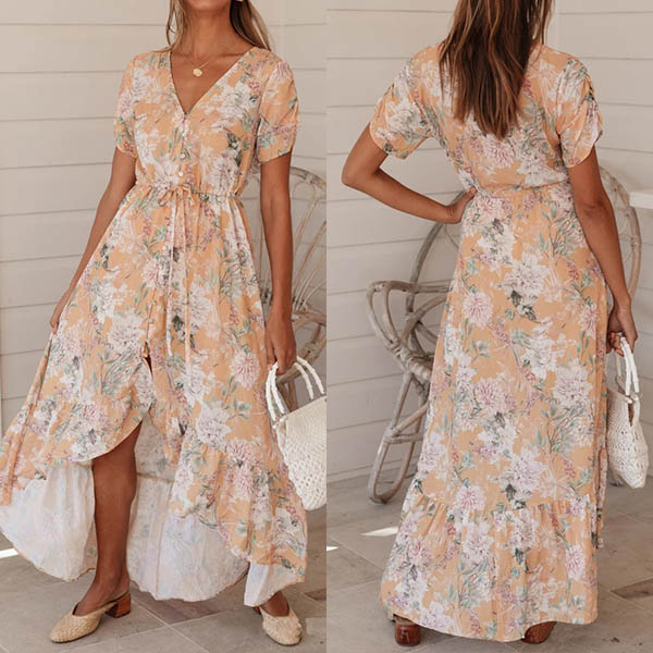 Wanna a beautiful beach look? Then dress yourself up with this printed dress. Features vibrant floral print details,finished with short sleeve,v-neck and an irregular ruffle hem,this dress knows how to make you look charming and stunning!