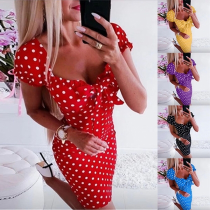 Sexy V-neck Short Sleeve Slim Fit Dots Printed Dress