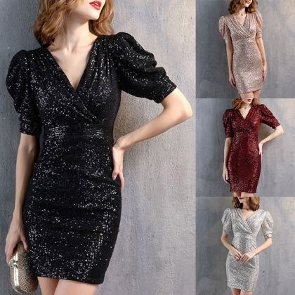 Sexy V-neck Short Sleeve Slim Fit Sequin Dress
