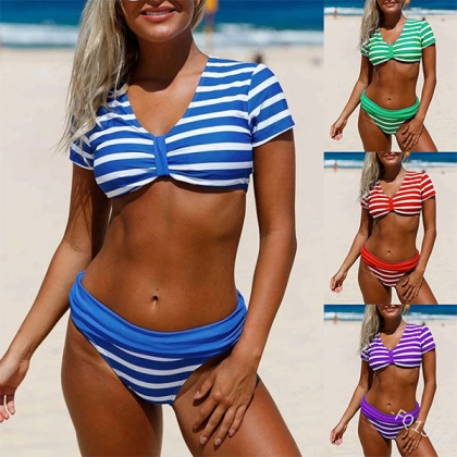 Sexy V-neck Short Sleeve Striped Bikini Set