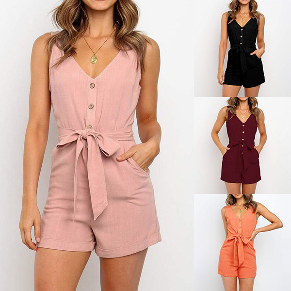 For these summer days,this sleeveless romper would be a wise choice. Features a solid color,the v-neck and front-button design can make you full of femininity,while the high waist and fit silhouette design will demonstrate your slender figure. Like this style? Then buy one!