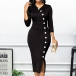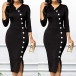 Sexy V-neck Slit Hem 3/4 Sleeve Front Button Slim Fit Dress