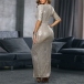 Sexy V-neck Slit Hem Half Sleeve Slim Fit Sequin Party Dress