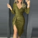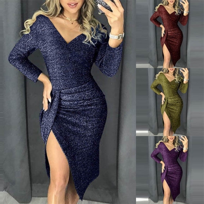 Sexy V-neck Slit Hem Long Sleeve Slim Fit Party Dress