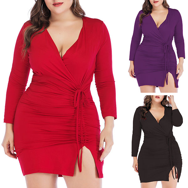 Still worrying about what to wear for your night events and weekend gatherings? Then all your worries can be solved if you have this dress in your team. Solid color style,finished with long sleeve,v-neck,slit hem and a fit silhouette,this dress can highlight your slender figure as well as boost your feminine appeal.