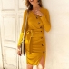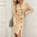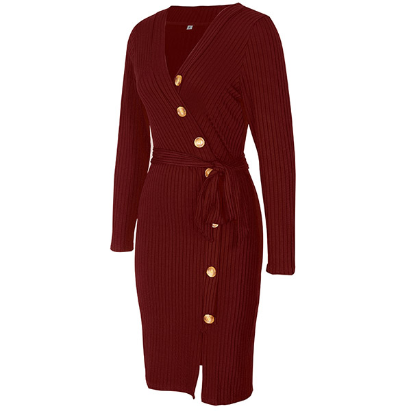 Sexy V-neck Slit Hem Oblique Button Slim Fit Knit Dress