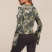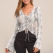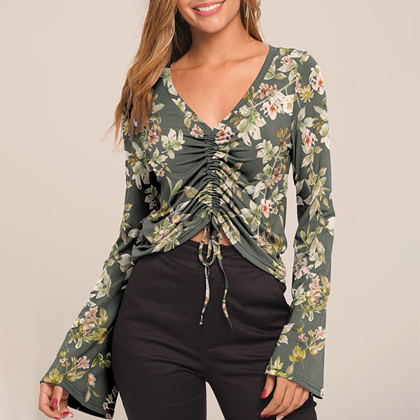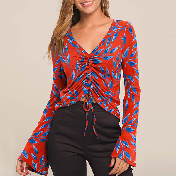 Sexy V-neck Trumpet Sleeve Drawstring Printed Top