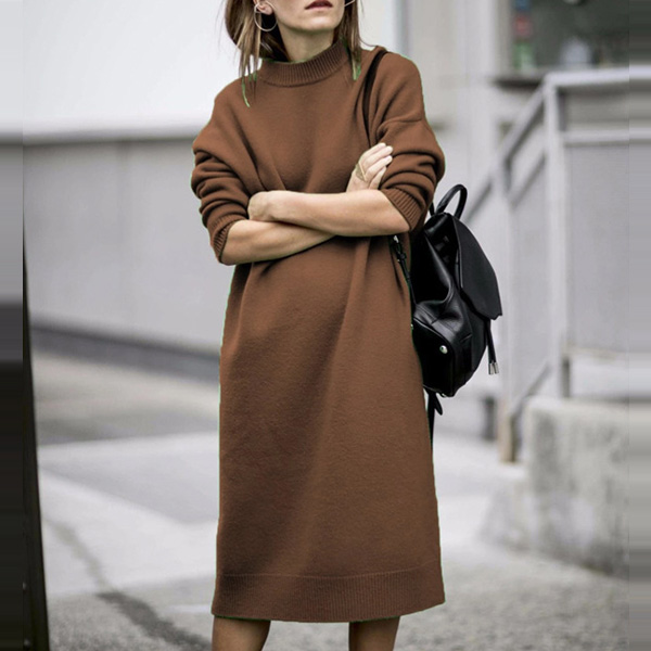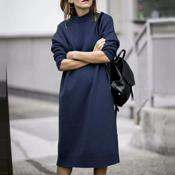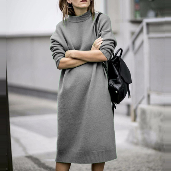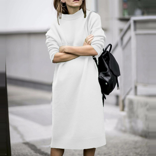 Any girl can look effortlessly stylish and charming in this knit dress. It boasts a solid color,finished with long sleeve,round neck and slit hem,this knit dress is perfect fit for these spring and autumn days. We thing matching with the ankle boots would be a good idea.