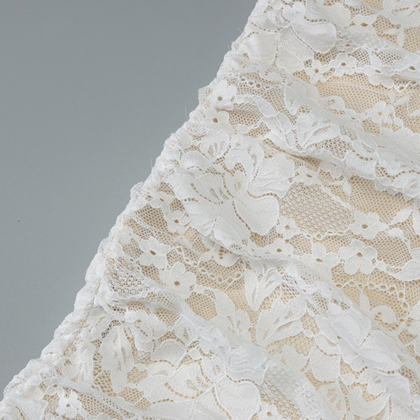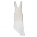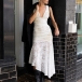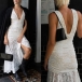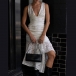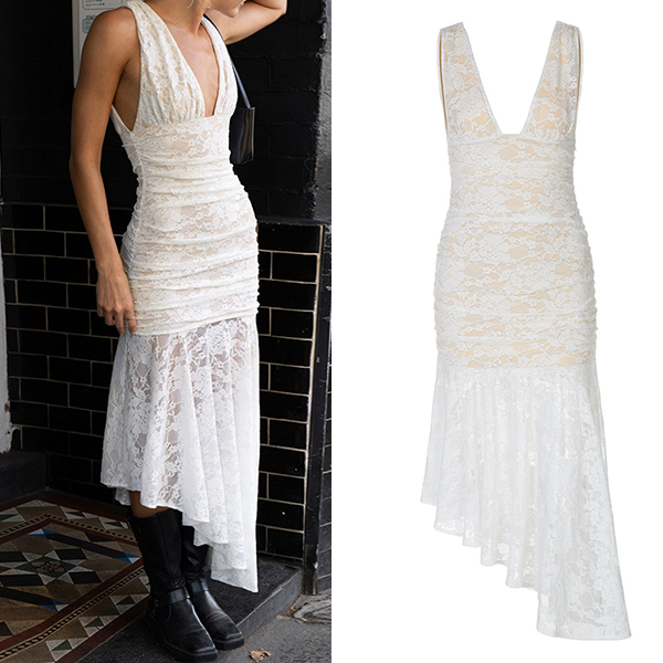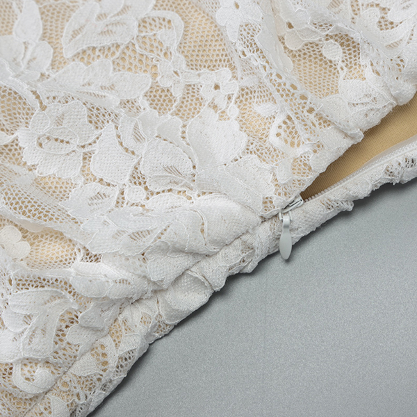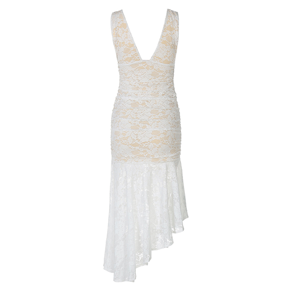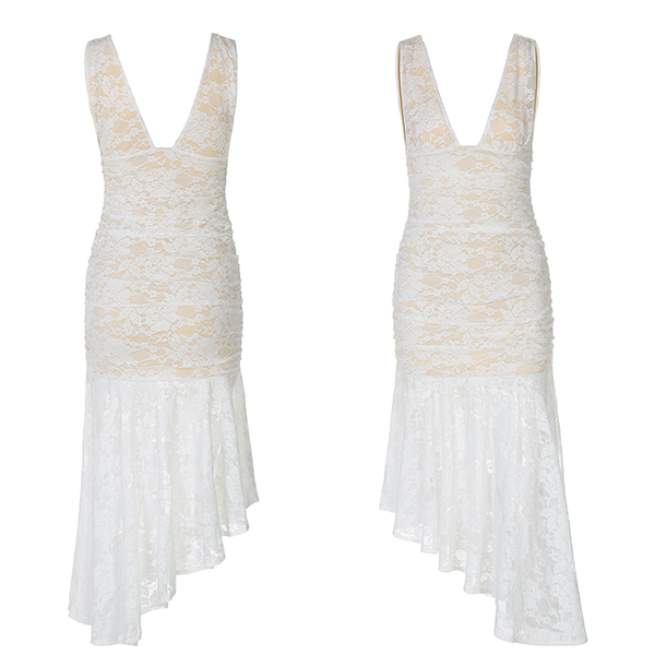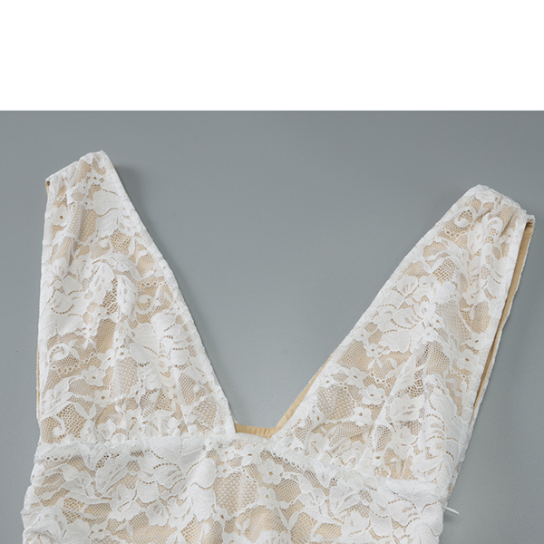 Elegant figurnära spetsklänning med djup V-ringning och öppen rygg