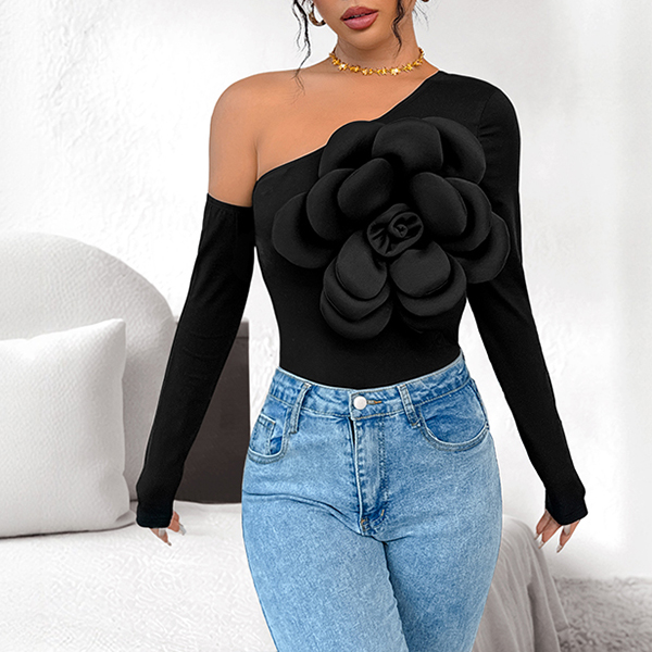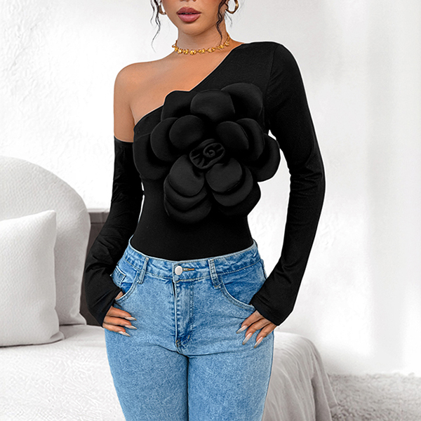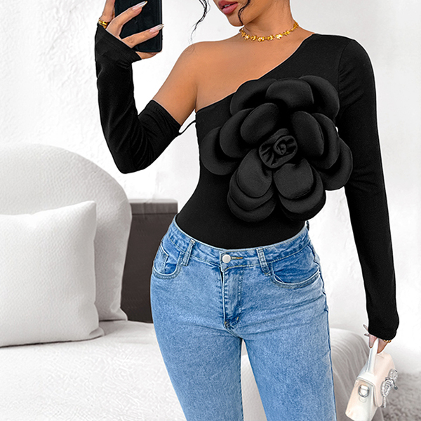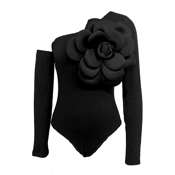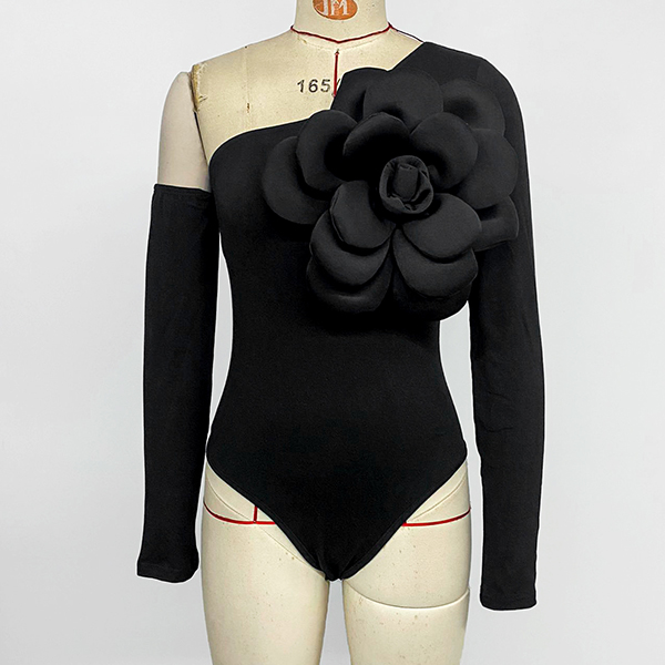 Denna svarta body är ett iögonfallande och elegant plagg som kombinerar trendiga designelement med en touch av femininitet. Den sneda axlarna ger bodyen en modern och edgy twist, vilket skapar en unik och iögonfallande silhuett. Medan 3D-blommiga utsmyckningar ger bodyen ett fantasifullt och lekfullt element, vilket skapar en dimensionell och iögonfallande look. Klä upp den med skräddarsydda byxor eller kjol för en utekväll, eller bär den med jeans för en mer avslappnad och edgy look.