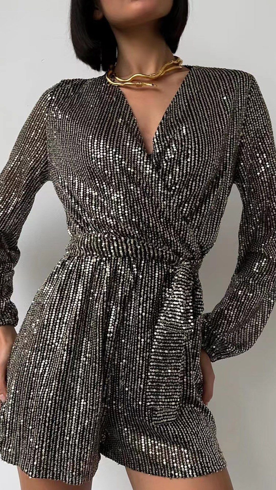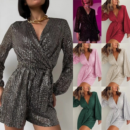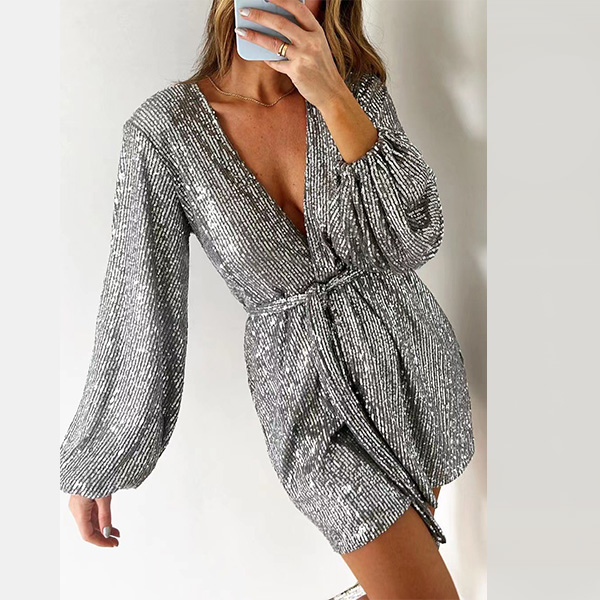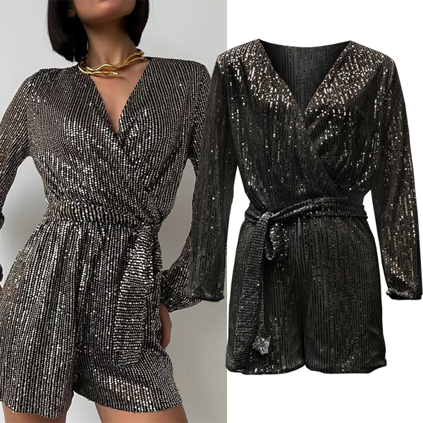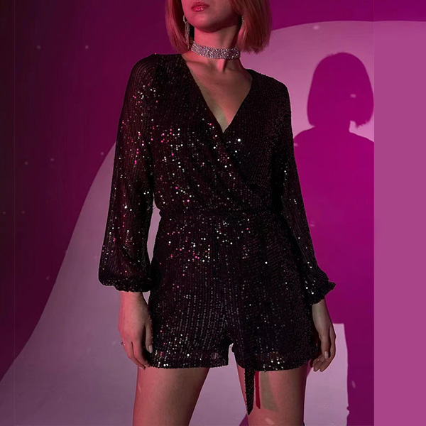 Det här är en trendig och iögonfallande produkt som kombinerar en bling-bling paljettdesign, en V-ringning, långa ärmar och en silhuett för en glamorös och modeinriktad look. Den är perfekt för en kväll ute, en fest eller vilket evenemang som helst där du vill göra ett uttalande.