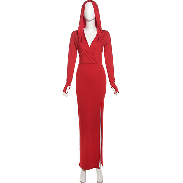 Maxiklänning i urban streetwearstil, långärmad med draperad V-ringning, huva och sidslits