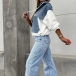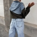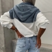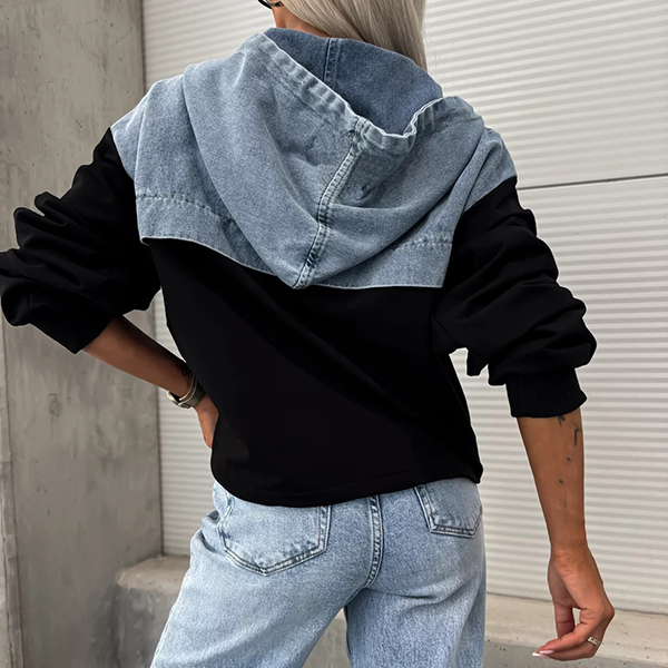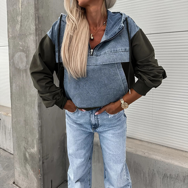Långärmad streetwear-hoodie i denim med halv dragkedja, luva och dragsko