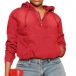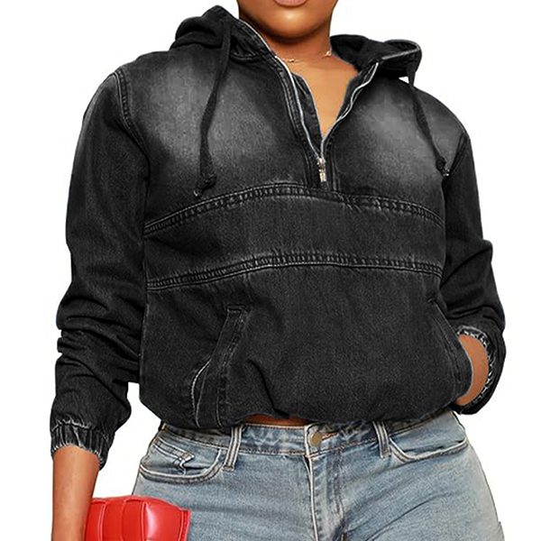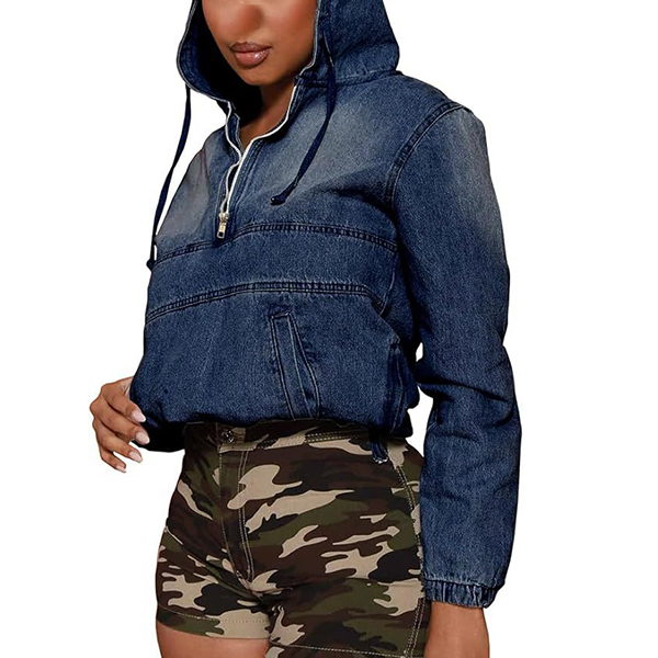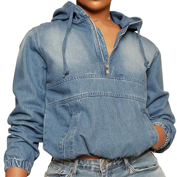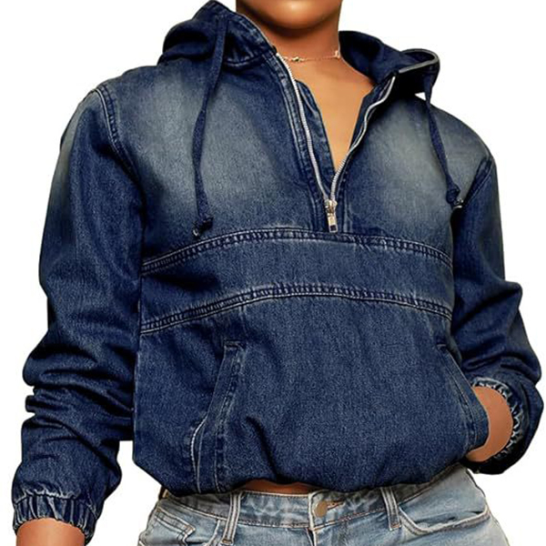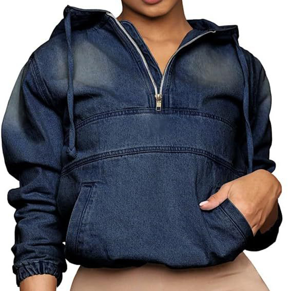 Denimskjorta med V-ringning och halv dragkedja – långärmad streetwear-modell med midjedragsko och kängurufickor