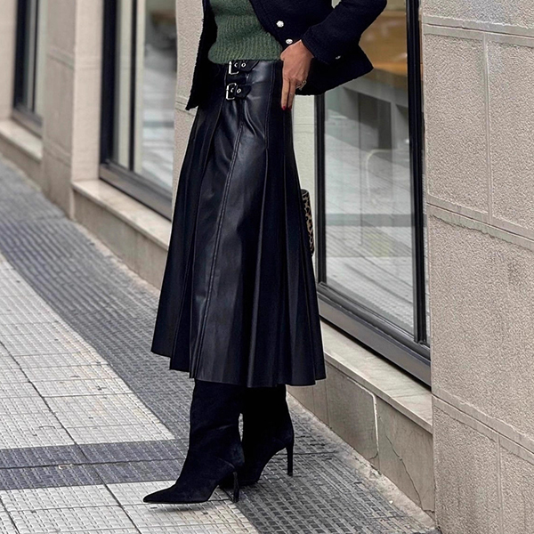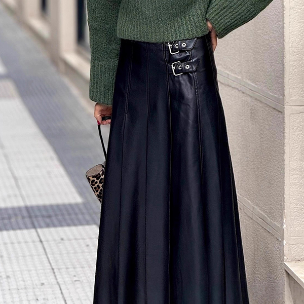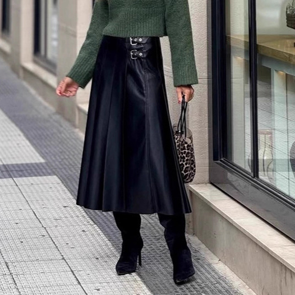Denna midikjol i exklusivt konstläder med dekorativa sidospännen ger din look en omedelbar urban edge. Den höga midjan formar en perfekt silhuett och framhäver dina kurvor med smickrande proportioner, samtidigt som det slitstarka PU-materialet tillför en modern metallic-lyster. Kombinera med en tajt topp och snygga ankelboots för en streetstyle-inspirerad outfit som drar blickarna till sig. En självklar statement-piece för festkvällar, modefestivaler och vardagsäventyr där du vill sticka ut med edgy elegans.