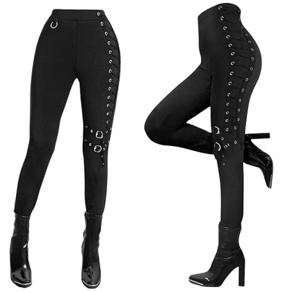 Dam skinnybyxor med hög midja – streetwear med spänne och snörning i sidan