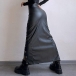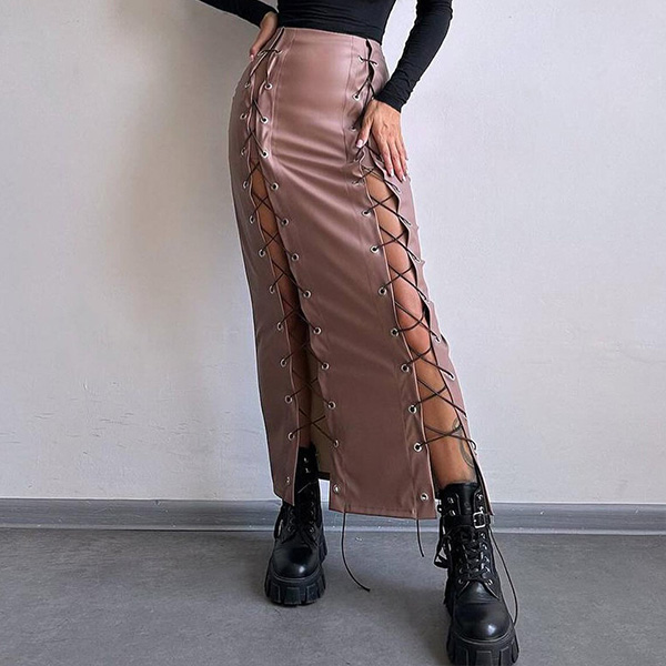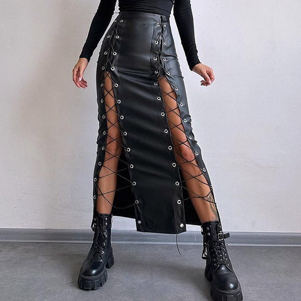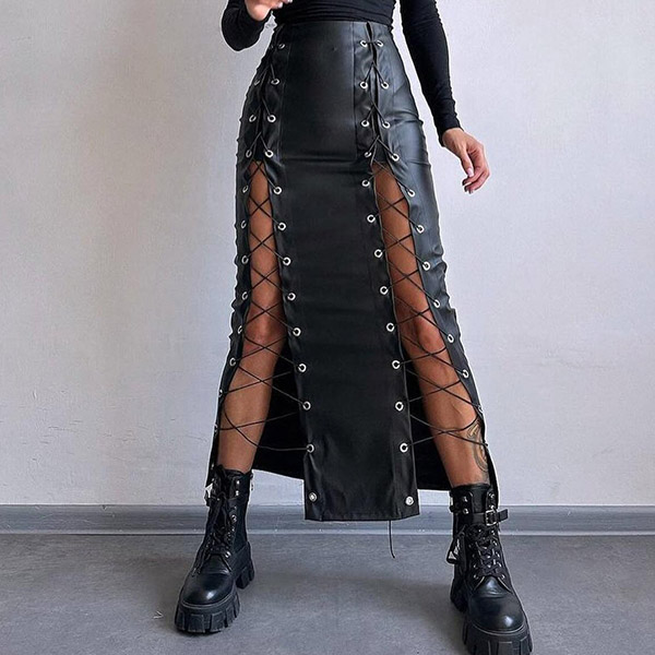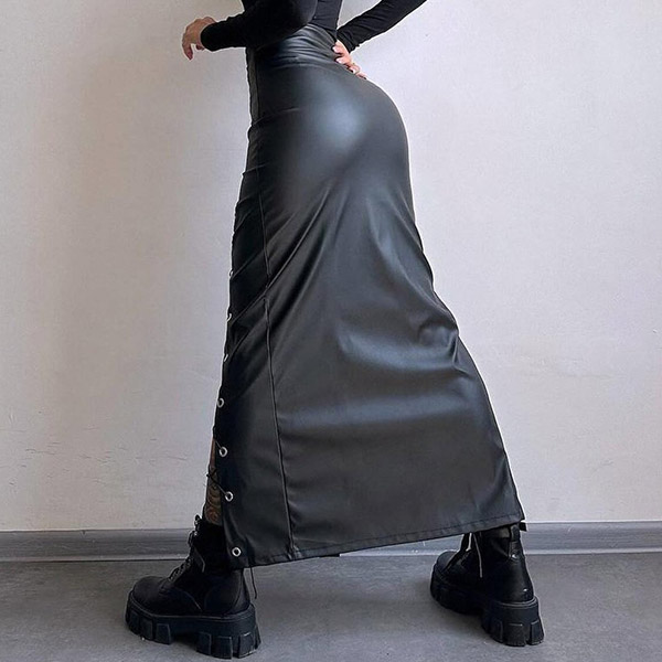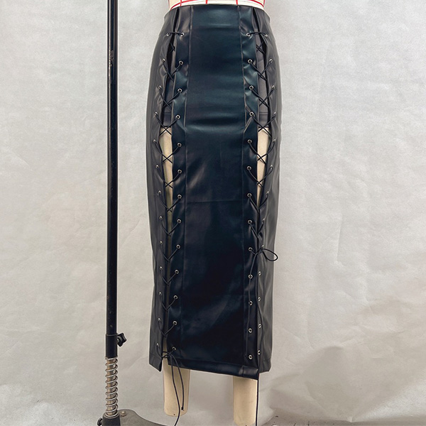 Denna tuffa kjol har slående snörningsdetaljer och en strukturerad konstläderkonstruktion som ger modern, urban street-sofistikering. Kombinera med åtsittande toppar och stridsstövlar för en autentisk street fashion-känsla. Perfekt för street fashion-tillfällen, urban styling eller moderna, tuffa kläder.