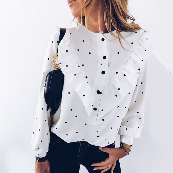 For a sweet and charming working look,you can have a try this shirt! Finished with long sleeve,round neck and ruffle design,sweet yet stylish. The dots printed details will offer you a more eye-catching look. Try to match with your favourite bottom to start your wonderful day!