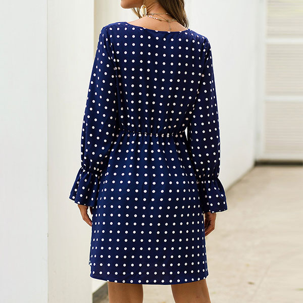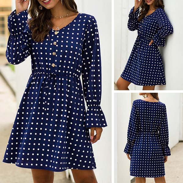 Looking for a proper dress for your daytime out or night dating? Then look no further than this dress. The dots printed details make this piece look so sweet and playful. Finished with long sleeve,v-neck and high waist design,this wonderful piece can showcase your slender figure while exuding your beauty and femininity.