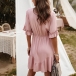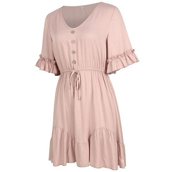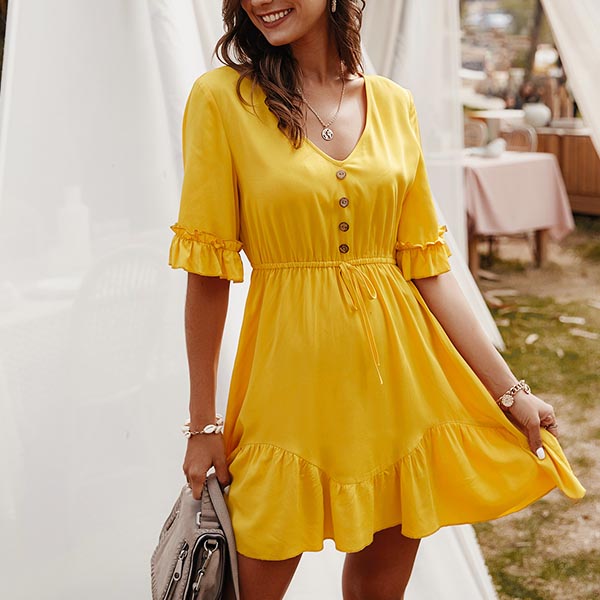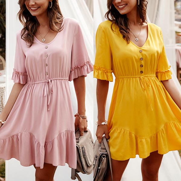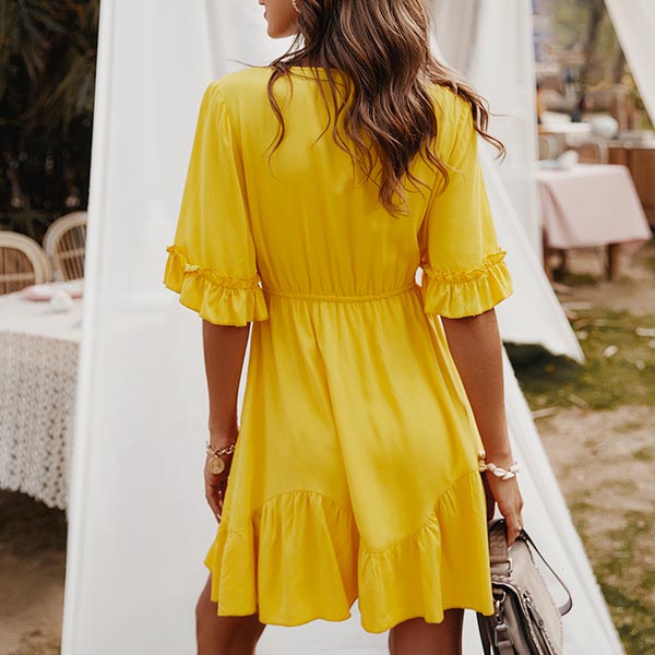 Looking for a proper dress for your afternoon tea time and weekend out with your friends will no longer be a problem once you have this dress in your team. It comes with a solid color,with lotus sleeve,v-neck and ruffle hem design,this dress can express your sweet and charming side. Add one to your wardrobe and it won't let you disappointed!