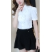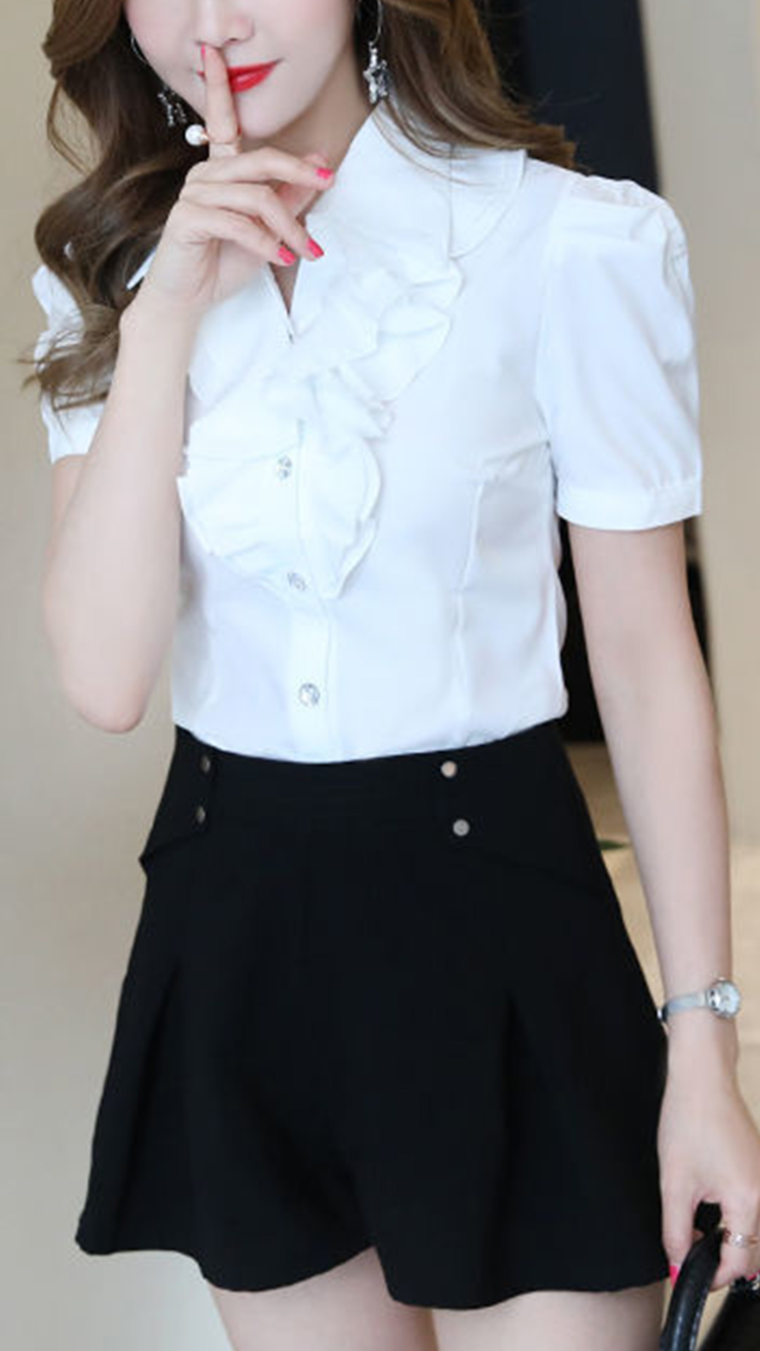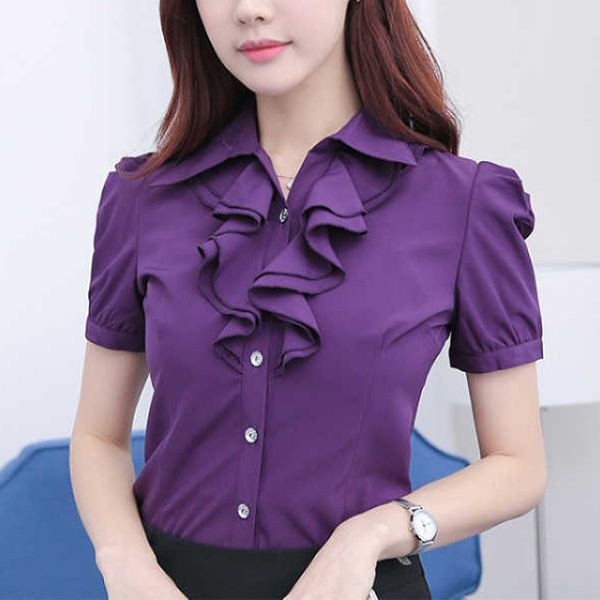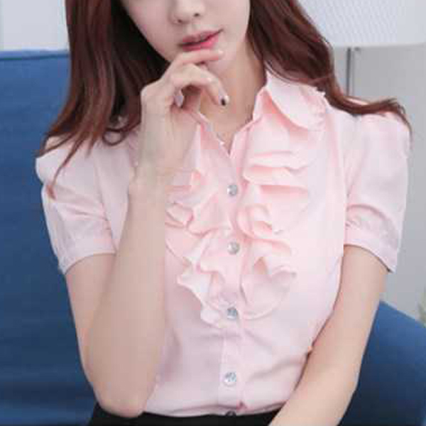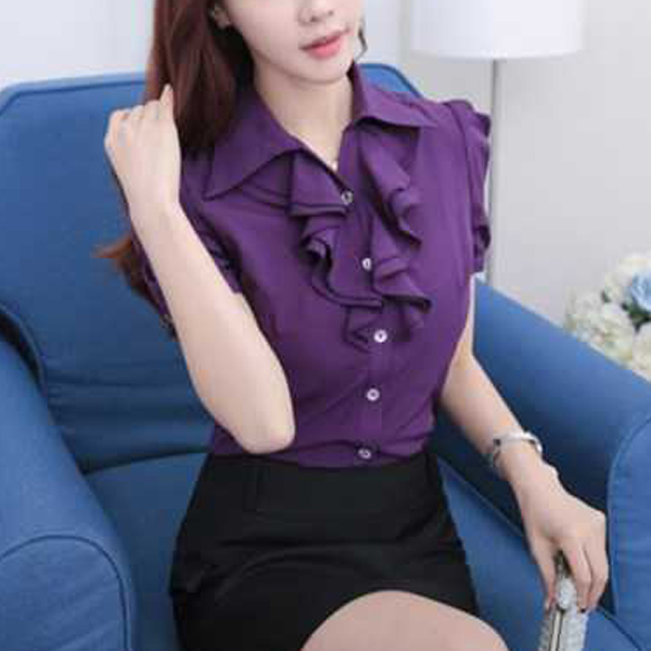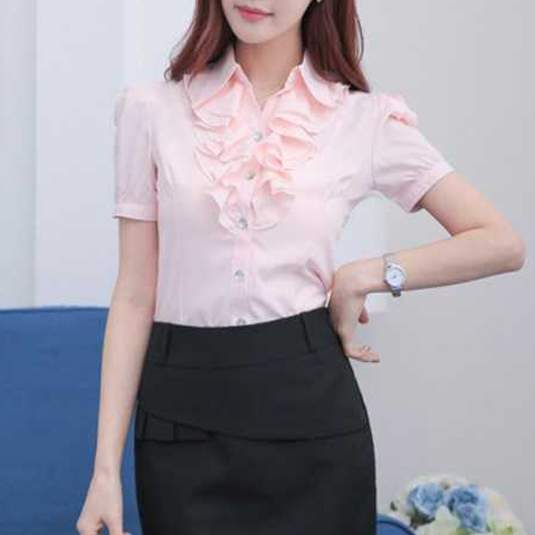For your workdays,this shirt is a wise choice. It comes with a solid color,finished with short sleeve,stand collar and ruffle design,this shirt that combines of sweet and stylish vibes knows how to give you an elegant,delicate yet confident working look. All-match design can offer you many matching opportunities.