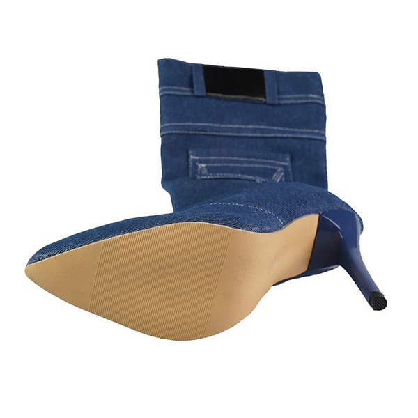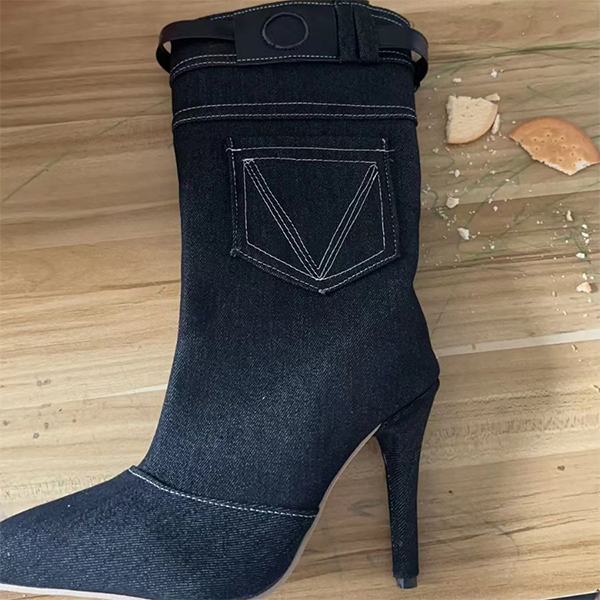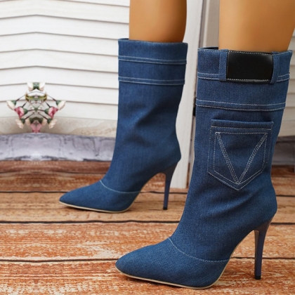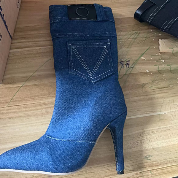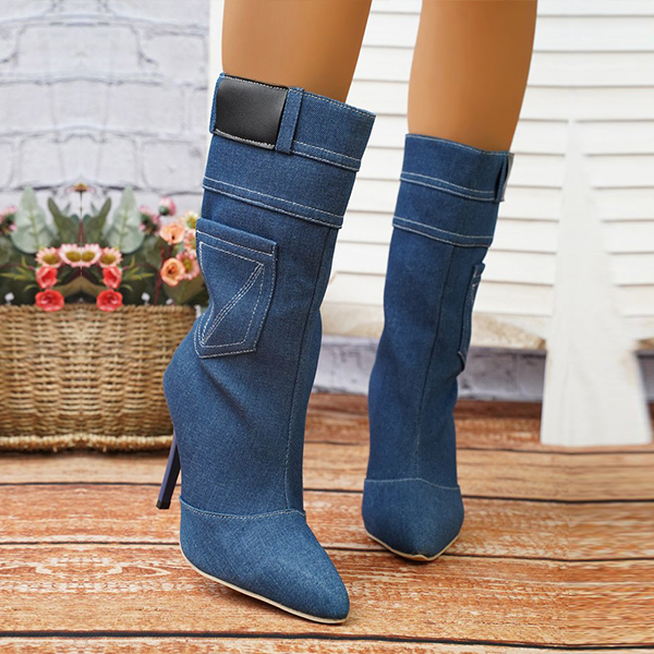 Tunna klackade jeansstövlar med spetsig tå Knight Style Knähöga stövlar