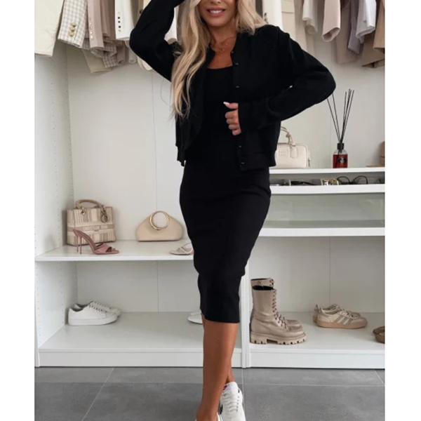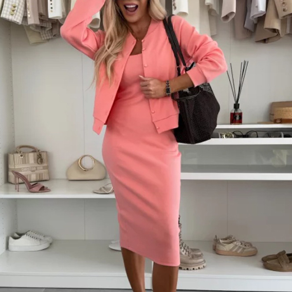 Moderiktigt tvådelat set bestående av kofta och åtsittande linneklänning
