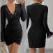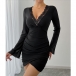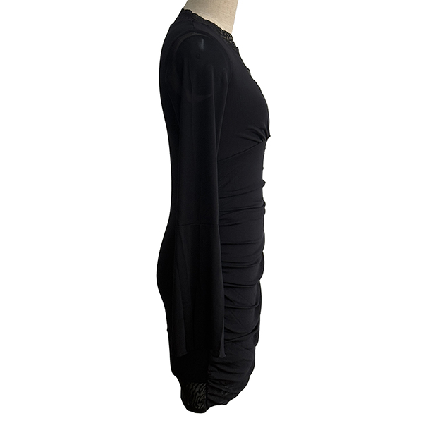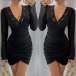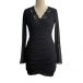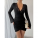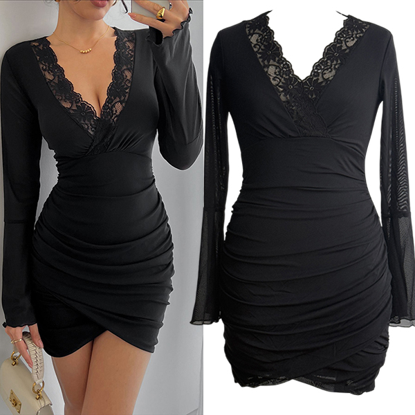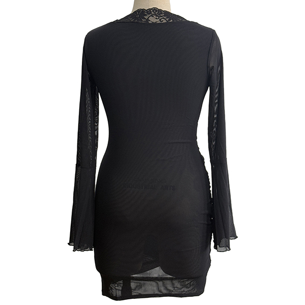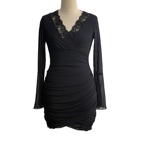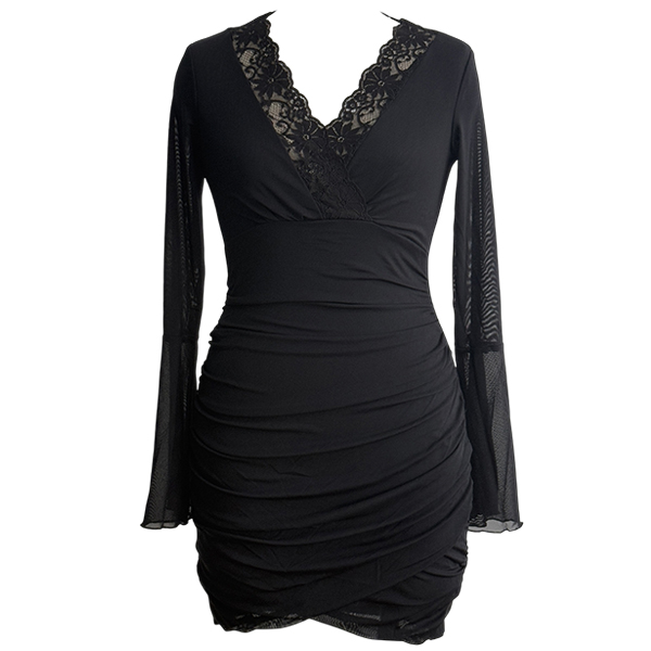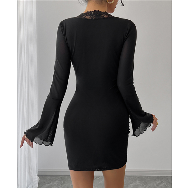 V-ringad miniklänning med vida volangärmar och meshspetskanter