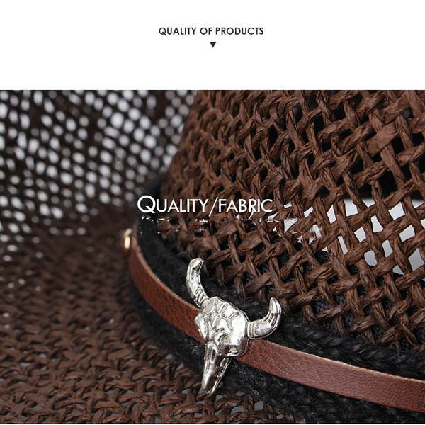 Vintage flätad halmcowboyhatt med tjurhuvudband – luftig western solhatt